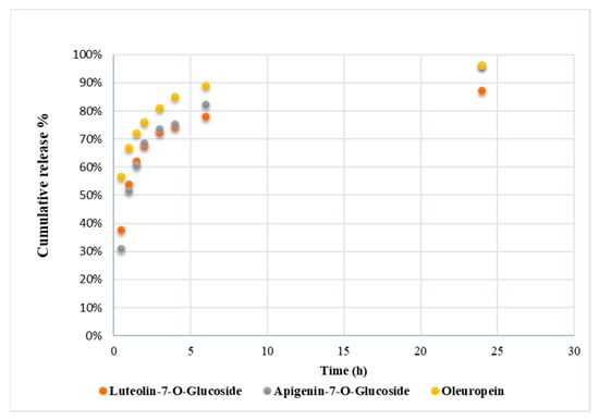 At the first 30 min, the amount of oleuropein released was about 60% of the total oleuropein content in the fiber. Then the release became more gradual, reaching about 90% after 6 h. Luteolin-7-O-glucoside and apigenin-7-O-glucoside after the first 30 min were released about 40% and 30%, respectively, with respect to the initially loaded quantity in the fibers, reaching about 80% after 6 h in both cases. Chromatograms are reported in Supplementary Materials (Figures S1–S3).
