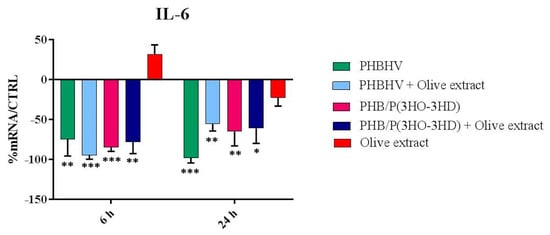 The expression of IL-6 is displayed in Figure 5. IL-6 resulted to be strongly downregulated by all the PHA fiber formulations with statistical significance (all p < 0.05). OLE alone did not significantly changed the IL-6 expression level at 6 and 24 h with respect to the basal expression level of HaCaT cells (p = n.s.). A specific effect of OLE incorporation in the fibers could not be revealed for IL-6 expression.