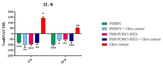 The outcomes of IL-8 expression are reported in Figure 6. Moreover, in this case, a strong downregulation of this cytokine was exerted by all the fibers independently of OLE incorporation (all p < 0.05). Differently, OLE alone caused a marked upregulation after 6 h (p < 0.05), which was still significant after 24 h (p < 0.01).