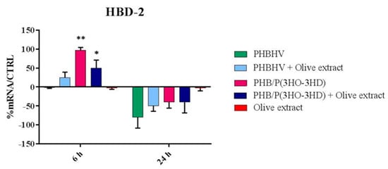 In this case, it was observed that only two PHB/PHOHD fiber formulations were able to promote the upregulation of HBD-2 with statistical significance, after 6 h, specifically PHB/PHOHD containing OLE (p < 0.05) and plain PHB/PHOHD (p < 0.01). OLE/PHBHV was able to increase the expression of this peptide without statistical significance after 6 h. OLE alone, at the same concentrations, did not show any effect on HaCaT cells.