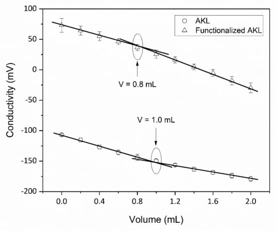 Samples of AKL and modified AKL were prepared at 50 ppm for this analysis. Aliquots of 10 mL to were taken and raised to 40 °C. Simultaneously a NaOH 0.01 N solution was placed on a burette and then added in volumes of 0.2 mL to measure conductivity with a Star A211 pH Meter (Orion, Waltham, MA, USA). The titration curve obtained was employed to determine the equivalent volume by the slope change using the midpoint criterion; additionally, the first derivative was calculated to increase the accuracy in the measurement.