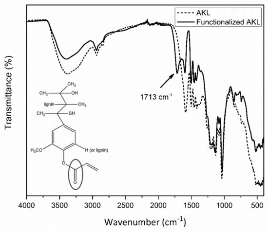 In Figure 2 the obtained spectra for AKL and modified AKL are presented. In this figure the principal vibrations bands for AKL located at 3400 cm−1 corresponding to the bending vibration of the -OH functional group, 1600 cm−1 generated by the stretching vibration of the ether functional groups attached to the AKL can be appreciated [30]. On the other hand, in the functionalized AKL spectrum the -OH bending vibration presents a decrease in intensity that suggests a partial reaction of the total population of -OH functional groups, while a new signal appears at 1713 cm−1 originated by the vinyl-ester group formed during the NSA reaction, according to Scheme 1. In addition, the decrease of the stretching vibration of the ether functional groups indicates a secondary reaction where R-O-R’ acts as a nucleophile in the same reaction. This type of reaction using acryloyl chloride in aqueous medium has been reported by other authors [31,32,33].