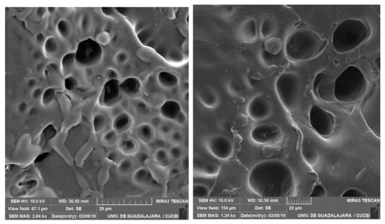 Hydrogel discs previously swollen in water were frozen. Then they were then fragmented into small pieces to observe the internal morphology of the hydrogels during the FE-SEM analysis. To eliminate the frozen water inside the swollen hydrogels, a lyophilizer was used, and the weight was monitored until it was constant. The fragments obtained were coated with gold using an ionic coating system. Finally, the morphology of the hydrogels was studied using a TESCAN (Brno, Czech Republic) brand field emission electron microscope with an accelerating voltage of 10 kV and different levels of magnification.