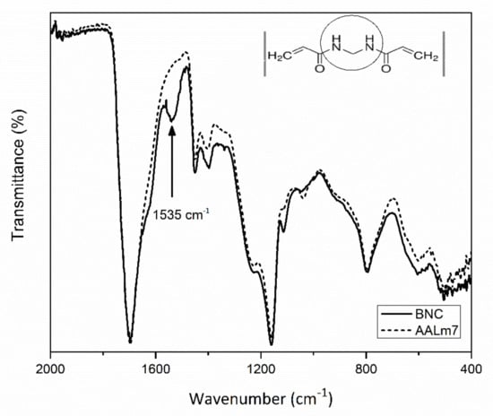 Figure 6 shows the FTIR analysis of a hydrogel sample with 7% of functionalized AKL and without. To substitute the effect of cross-linked and formed hydrogel, N,N-methylenebisacrylamide (NMBA) was added to the sample which does not have AKL. Both spectra show a great similarity, the only difference appearing at 1535 cm−1 that corresponds to the amide functional group on the cross-linked N,N-methylenebisacrylamide groups of the hydrogel. This means that the addition of AKL creates a good cross-linked structure and can be a good substitute of NMBA, which has been reported to be a harmful substance to cells and microorganisms [38].
