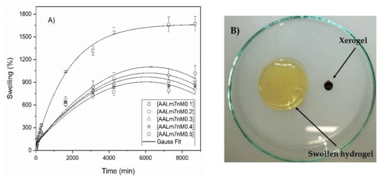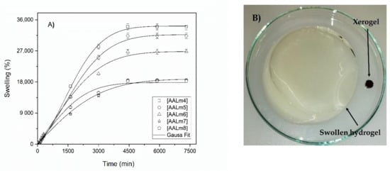 Swelling in water of hydrogels with AA and functionalized AKL. (A) Swelling behavior of hydrogels, (B) comparative capture of xerogel and swollen hydrogel.