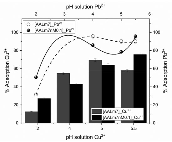 Removal percentage of Pb2+ and Cu2+ at different pH of the samples AALm7 and AALm7nM0.1.