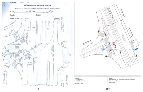 Current methods that traffic police in the Czech Republic use involve two main stages. The first includes in situ measuring (using a surveying wheel and steel tapeline, predominantly) and sketch creating (Figure 1a). The accuracy of the measurements is on the order of decimeters. The second step involves creating a plan in the specialized software (in the office) based on a sketch created on a traffic accident site. This plan is in the local coordinate system, with the possibility of measurement (Figure 1b). The amount of time spent creating sketches and plans depends highly on the traffic accident type, including the number of involved vehicles. In the case of the traffic accident depicted in Figure 1, it took approx. one hour to create a sketch and another two hours to create a plan at the office. Sometimes Google Maps, with a combination of initial measurement points, is used to create a plan from a sketch. Traffic police typically use tourist GNSS to obtain the absolute coordinates of the center of the traffic accident site. Using this central point, they can approximately place the plan into the absolute coordinates system, but they do all measurements in the local coordinates system. The measurements are related to the initial measurement point (e.g., a lamp drawn in a technical map); therefore, the absolute position accuracy of the traffic accident site is not important for our investigation []. The whole process is quite time consuming, considering this example does not represent a serious accident that involves more vehicles, skids, debris, injured persons, casualties, etc. It could be quite unfeasible to measure and draw every important distance using a handmade sketch. Although traffic officers take many images of the traffic accident site using a digital single lens reflex (DSLR) camera, the resulting pictures are not to scale. Some evidence might be useless in situ and therefore officers do not present it in a plan. Consequently, officers might miss it in further investigations. Moreover, there are gentle differences between measurements, sketches, and plans that different traffic officers create. It is highly dependent on experiences, dexterity, abilities, etc.