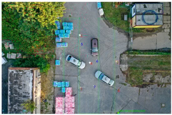 A general overview is depicted in Figure 2. We positioned three cars (A, B, C) to simulate a real traffic accident, around which we set rectangular (1, 2, 3, 4) and round (8) objects with known dimensions and three points designated to the distance measurements (5, 6, 7). After each of the flights, we measured three distances between given points (5, 6, 7). The trajectory of the third flight is also depicted. To assess the accuracy of the final model, we used objects and points. To assess the accuracy inside and around the arranged traffic accident, we dislocated reference objects and points.