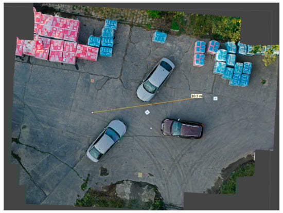 In addition, this model could be used as a 3D model with the possibility of measurement too (Figure 5). The parallel areas to the camera view axis do not have the same overall graphical quality as the perpendicular areas to the camera view axis, which can be observed on imprecise textures (vehicles’ doors) in Figure 5. If this would be important for traffic accident documentation, a few oblique images should be required and added to image processing.