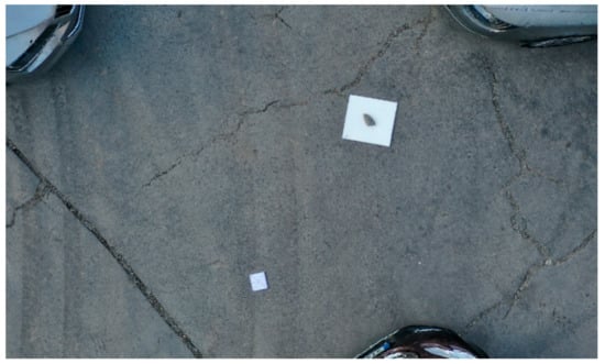 Testing this proposed method during a real traffic accident was not feasible due to legislation restrictions. Therefore, an experiment took place inside a closed area in Opava in the Moravian-Silesian region of the Czech Republic. We arranged a traffic accident, involving three cars (due to the reason mentioned earlier) and reference objects. Buildings, trees, wires, fences, and construction materials were present quite close to the site. The arranged traffic accident surroundings were rather complicated compared to usual real traffic accidents. The day of the flight was sunny, with a temperature around 25 °C, and the wind speed was 3.6 m·s−1.