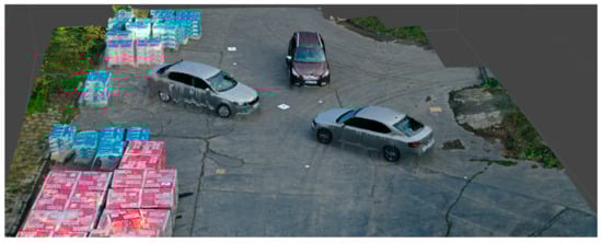 The whole experiment design (including flight path, reference object positions, image processing, etc.) was designed to produce the most accurate ground plan of arranged traffic accidents (in the local coordinate system). This model was supposed to be very similar to the traffic police’s plan, which makes it possible to replace the traffic police’s plan. Regardless of the need for a 2D model, which is usually produced by the traffic police, we created a 3D georeferenced model to be used and treated as a ground plan, with very precise measurements (Figure 3).