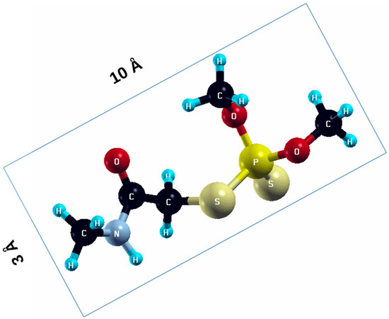 The commercially available Graphene Oxide Powder (GO) and Industrial-Quality Graphene (IG) were purchased by ACS Material, Pasadena, CA, USA. IG represents light black flakes, with thickness ≤ 3.0 nm and BET surface area near 600 m2g−1. GO is a grey–green powder with particle diameter between 1~15 μm, thickness 0.8~1.2 nm, and specific surface area 5–10 m2g−1 [27,28]. DMT (O,O-dimethyl S-[2-(methylamino)-2-oxoethyl] dithiophosphate) [29] was obtained by Pestanal, Sigma Aldrich, Denmark. The stock solution 1 × 10−1 mol dm−3 solution was prepared in 10% ethanol (EtOH) and kept in the refrigerator before use. The working solutions were made by the dilution of the appropriate aliquot in doubly distilled water. The 3D DMT structure is presented in Figure 1.