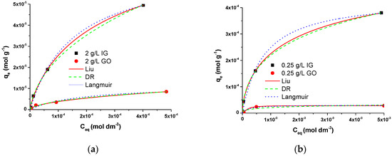 Experimental data (points) for (a) 2 g dm−3 and (b) 0.25 g dm−3 IG and GO fitted with Langmuir (blue), Liu (red), and Dubinin–Raduschevich (green) adsorption isotherms.