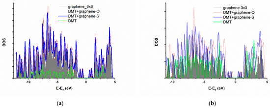 Total electronic density of states (DOS) of pristine graphene, compared to the graphene with adsorbed DMT, for (a) 6 × 6 supercell and (b) 3 × 3 supercell. Fermi level is taken as energy zero. Grey surface—isolated DMT, red line—pristine graphene, blue line—graphene with adsorbed dimethoate.