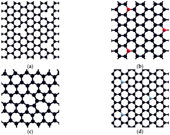 Investigated defect model surfaces (3 × 3 graphene supercell): (a) monovacancy (MV) defect, (b) oxydefect, (c) SW defect, and (d) N-defect (carbon = black, oxygen = red, nitrogen = grey).