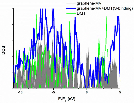 Total electronic densities of states (DOS) of monovacancy (MV) defect graphene compared to the graphene with adsorbed DMT. Grey surface—isolated DMT, red line—pristine graphene, blue line—graphene with adsorbed dimethoate. Fermi level is taken as energy zero.