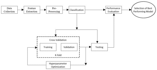 To investigate the problem of underfitting or overfitting resulting from a simple holdout validation, the dataset should be split into a training set, a validation set, and a testing set to judge how the algorithm will perform with new external data. In this case, the training set is used to train the model, the evaluation is performed on the validation set to minimize bias and variance and a final evaluation is performed on the test set to evaluate if the algorithm is either underfitting or overfitting. However, partitioning the available data into three distinct sets will reduce drastically the number of samples used for training the model. As a result, cross validation (CV) was used to evaluate our machine learning models with limited data samples. The test set had to be held out as before, but the validation test was not needed since the cross validation (CV) handled validation by itself within the training set. The main principle behind CV such as k-fold is to split the training set into k smaller sets and to train the model on k − 1 sets. Validation of the model is performed on the remaining part of the data set to compute the performance measure. This process is repeated k times so that each k-fold serves as a validating group once, while the performance measure will be an average of the measure for each k-fold. In our multi-class application, the f1-macro was adopted as the performance measure. It is defined as the average of the harmonic mean of precision and recall for all classes. The f1-macro was calculated for each k-fold and averaged to obtain the final performance measure for a fixed set before parameter tuning. The data set was split in to training set (70%) and test set (30%) and the cross validation was carried out within the training set.