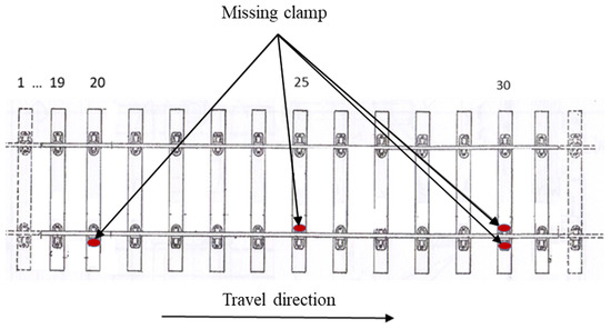 The sensor was powered using a 12V62AH battery and the measured raw data were recorded using a laptop. The considered track sections consisted of concrete sleepers with E-clip fasteners. Tracks which were relatively healthy and track sections with damages were all considered for this study. Some of the visible damages on the rail head included squats, rail corrugation, crack and head checks. Figure 2b depicts a fastening system with intact clamps, a fastening system with one missing clamp and a fastening system with two missing clamps. A controlled measurement sequence was carried out along the track section to obtain the dataset for the e-clip fastening system. A pattern of missing clamps was created, along a measurement sequence, where clamps were removed from the outer and the inner side as well as from both sides at the 20th, 25th and 30th sleeper respectively, from the starting position of the measurement (refer Figure 3). This measurement sequence was carried out along various sections of the track. A fastening system with intact clamps was considered as a healthy system and fastening systems with one clamp missing (stage 1 fault) and two clamps missing (stage 2 fault) were considered as faulty system for this study.