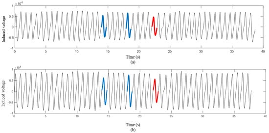 Figure 4a,b shows the time signal plot after demodulating, resampling, filtering and rotating the raw signal, for both the driving field for a single measurement sequence. The measurement was carried along a short section of the track having 47 sleepers. This section of the track was relatively healthy without any damages to the railhead. The zero crossing in the signal from the positive to the negative induction represents the centre positioning of the fastening system. The zero crossing was used as a way to segregate individual fastening systems. Individual fastening systems are easily distinguishable from the time signal plot for both driving channels. A drop in amplitude of the fastener signature is visible at those positions where the clamps were missing from the fasteners. Missing clamps cause reduction in the metallic material and changes the geometry of the fastening system, thus reducing the amplitude of the return field. The healthy fastening systems with intact clamps are depicted using black markers and fastening systems with one clamp missing and fasteners with both clamps missing are represented using blue and red markers respectively.