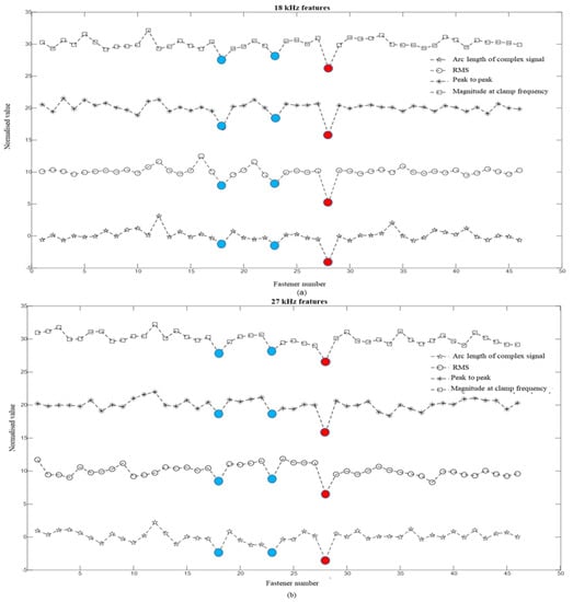 Standardised features for the measurement sequence (Figure 4) extracted from: (a) 18 kHz channel, (b) 27 kHz channel. Fastening systems with one clamp missing are depicted with blue markers and fasteners with both clamp missing are depicted using red markers. Healthy clamps are indicated with black markers.