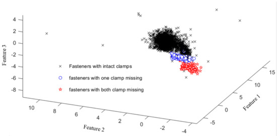 A total of 2967 fastener signatures were used for this study, of which 2700 samples (91%) of the instances correspond to a healthy state (stage 0) with intact clamps, 168 samples (5.67%) correspond to faulty fasteners with one clamp missing (stage 1) and the remaining 99 samples (3.33%) represent a faulty state with both clamps missing (stage 2).