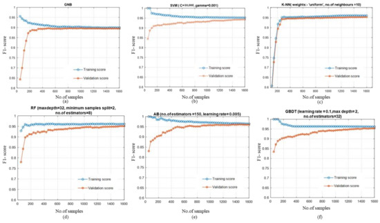 Learning curve with respect to number of training samples and F1-score for all algorithms: (a) Gaussian naive Bayes, (b) SVM, (c) K-NN, (d) RF, (e) AB, (f) GBDT. The best hyperparameter combinations/values after cross validation are marked above for each algorithm.