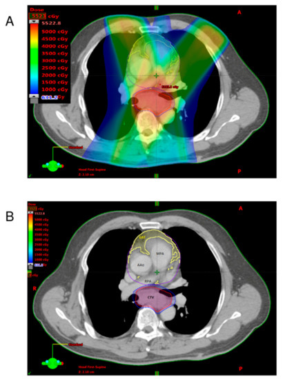 - Lin, J.B.; Hung, L.C.; Cheng, C.Y.; Chien, Y.A.; Lee, C.H.; Huang, C.C.; Chou, T.W.; Ko, M.H.; Lai, Y.C.; Liu, M.T.; et al. Prognostic significance of lung radiation dose in patients with esophageal cancer treated with neoadjuvant chemoradiotherapy. Radiat. Oncol. 2019, 14, 85. [Google Scholar] [CrossRef]