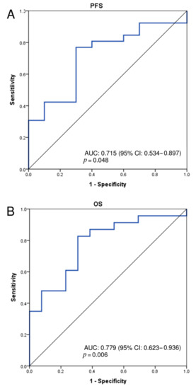 Receiver-operating characteristic curves for (A) progression-free survival AUC = 0.715 and (B) overall survival AUC = 0.779. AUC, area under the curve; CI, confidence interval.