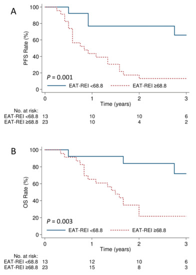 Kaplan–Meier estimates of the 3-year (A) progression-free survival p = 0.001 and (B) overall survival p = 0.003 according to EAT-REI cut-off value (68.8 cGy/mL).