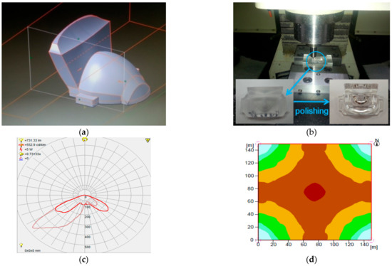 Based on the viewing angle data of the LED PKG, various types of optical lens were designed using LightTools software, as shown in Figure 2a. After theoretical analysis of the light distribution of the LED PKG with an optical lens, four types of lens were selected as candidates for the seaport light source. According to the design of each lens, four types of optical lens were fabricated using a high-speed precision processing machine with PowerMill software, and then, the surface of the lens was polished for high transmittance, as shown in Figure 2b.