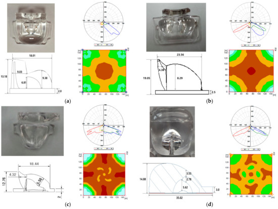 Design drawing, photo of fabricated optical lens, measured luminous intensity distribution, and simulated light distribution of lens type A (a), B (b) C (c), and D (d) (the parameters listed in Table 1 were used for the simulation of light distribution).