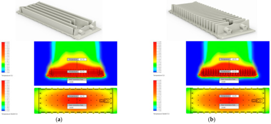 The LED module was designed for rated power of 250 W with 48 LED PKGs (4 LED PKGs in serial × 12 LED PKGs in parallel). The operating voltage and current for each LED PKG is 11.7 V and 400 mA, respectively. In order to effectively dissipate the heat generated from the LED chip, the LED is attached to the heat dissipation pattern on the upper side of the PCB with vertical via hole that reduces the heat primarily, and the vertical via hole is in contact with the heat dissipation coating layer at the bottom of the PCB. It is designed so that heat is secondarily conducted to the lower surface, which is close to the aluminum die-casting body with a high heat dissipation coefficient [26]. The thermal characteristics of heatsink were investigated with Solidworks flow software, as shown in Figure 4. A total of four types of heatsink (type A with vertical fin, type B with horizontal fin, type C with triangle fin, and type D with hexagonal fin) were analyzed, and the results are summarized in Table 3. In the simulation, the total amount of fins for type C and D was 118. As a result of these numerical analyses, the heatsink type D with a hexagonal fin shows the best thermal characteristics of 58.4 °C at the top of the heatsink, and this means an improvement of 6.8 K in thermal dissipation performance compared to that of type A.
