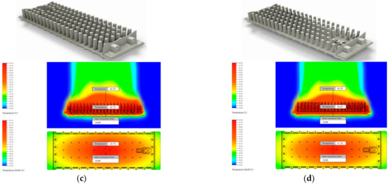 Heatsink design and thermal analysis result of type A with vertical fin (a), type B with horizontal fin (b), type C with triangle fin (c), and type D with hexagonal fin (d).
