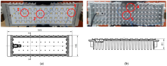 To measure the real thermal characteristics, four LED modules were fabricated with each heatsink type A, B, C, and D, respectively. The 3D dimension of each heatsink was 565 mm × 185 mm × 81 mm. Five thermocouples (from point 1 to point 3: near the LED PKGs top side of the heatsink, point 4 and 5: on the bottom of the heatsink) were attached to monitor the temperature of each heatsink, as shown in Figure 5.