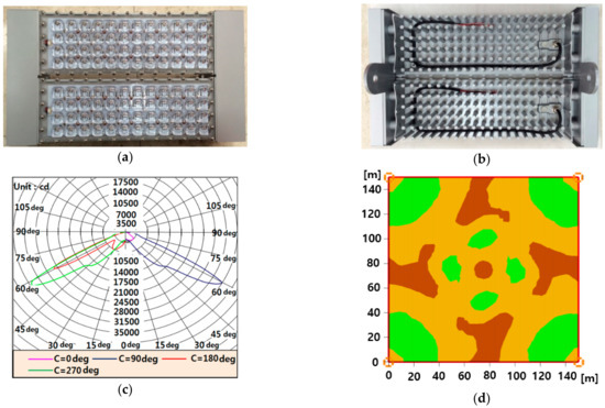 The prototype of the seaport luminaire with a rated power of 500 W consists of two LED modules with an optimized lens and heatsink (i.e., lens type of D and heatsink type D), as shown in Figure 6a,b. The total lighting output of this luminaire was 59,162 lm with an input power of 493 W, which means that the luminous efficacy of this luminaire is about 120 lm/W. To verity the feasibility of this seaport luminaire, the asymmetric characteristics of light distribution were measured using a gonio-photometer, as shown in Figure 6c. Then, light distribution was simulated using Relux software considering 150 m × 150 m of the illuminated area, as shown in Figure 6d. The results of simulation show the calculated average illuminance of 92.0 lx, minimum illuminance of 53.3 lx, and thus, overall uniformity of 0.71, which is a value that meets the required overall uniformity of 0.70 in seaport lighting application.