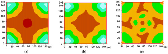 Simulation results of light distribution considering real dimension (150 m × 150 m) of seaport installation: commercial metal halide luminaire (a), commercial high-pressure sodium luminaire (b), and fabricated prototype LED luminaire (c).