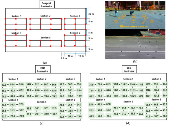 To measure the actual optical performances of the developed prototype LED seaport luminaire, we set up a testbed at a real seaport with an installation of an LED luminaire and an HID luminaire. At the seaport area, a total of six sections with 56 measurements points were selected, as shown in Figure 8a, and illuminance sensors were installed at every one of the 56 measurement points to get the illuminance data, as shown in Figure 8b. The measured illuminance values for each measurement point were presented in Figure 8c for HID luminaires (1000 W HID luminaire × 12ea) and Figure 8d for LED luminaires (500 W LED luminaire × 12ea).