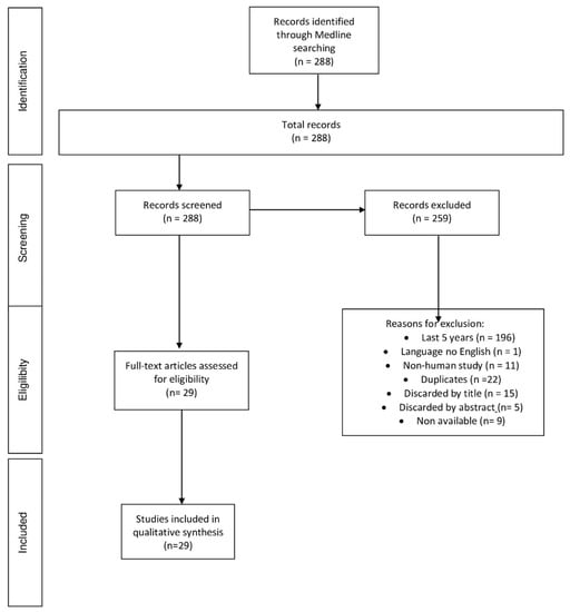 The search identified 288 preliminary results in Medline. Of these, 259 were removed (196 were not from the last 5 years, 1 was not written in English, 11 were non-human studies, 15 were discarded by title, 5 were discarded by abstract and 9 were not available). The resulting 29 articles were assessed by full-text screening and all of them were considered suitable for qualitative synthesis (Figure 1).