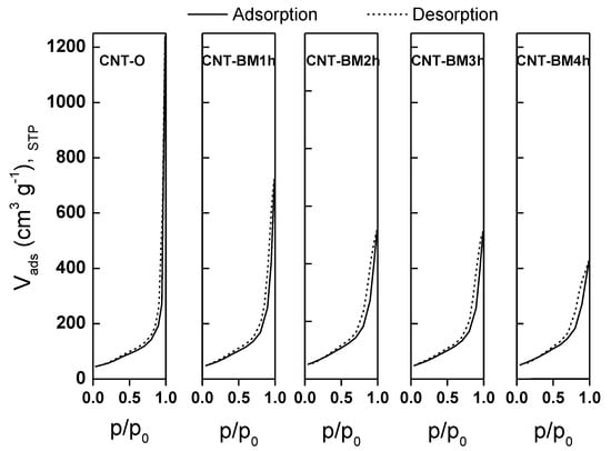 The characterization of ball-milled CNT samples is of particular importance since it is well known that particle morphology influences the porosity and the microstructure of the final composites [27]. The textural properties of CNT samples were evaluated by the N2 adsorption–desorption isotherms for original and modified CNT samples (Figure 1).
