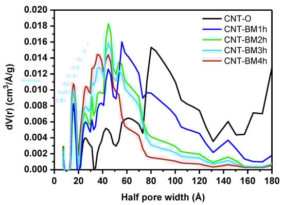 The pore size distribution (PSD), which is a measure of the distribution of pore volume concerning pore size (Figure 2), was also determined. The results obtained for ball-milled CNT samples showed significant changes in PSD compared to the original CNT sample. For the ball-milled samples, the number of pores with a half pore width higher than 80 Å is notably lower than the original sample. At the same time, new contributions were observed in the PSD of ball-milled CNTs for pore radius lower than 80 Å. The effect of BM treatment is even more evident for pore radius around 18–40 Å, where the sample CNT-BM 4 h presents larger peaks compared with the other ball-milled materials. This can be explained by the opening of CNT tips during the BM technique [39].