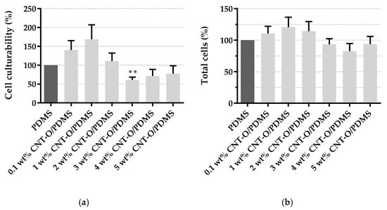 Percentage of E. coli CECT 434 GFP (a) culturable and (b) total cells after 24 h of biofilm formation on PDMS (control) and CNT/PDMS composite surfaces with different CNT-O loading (ranging from 0.1 to 5 wt%). The means ± standard error (SE) for three independent experiments are illustrated. Significant differences were considered for p-values < 0.05 (** p < 0.001).