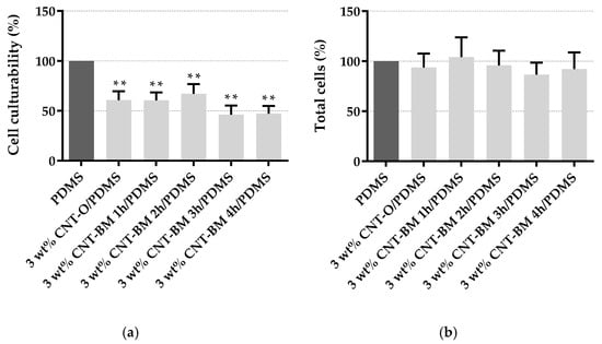 Percentage of E. coli CECT 434 GFP (a) culturable and (b) total cells after 24 h of biofilm formation on PDMS (control), 3 wt% CNT-O/PDMS and 3 wt% CNT/PDMS composite surfaces containing 1, 2, 3 and 4 h ball-milled CNTs. The means ± SE for three independent experiments are illustrated. Significant differences were considered for p-values < 0.05 (** p < 0.001).