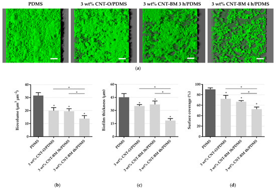 Although all the tested surfaces presented significant reductions in the three parameters analysed—biovolume, biofilm thickness and surface coverage—the 4 h ball-milled CNT/PDMS surface yielded the best results. In fact, when compared with 3 wt% CNT-O/PDMS, 4 h ball-milled CNTs composites reduced the amount of biofilm per surface area, biofilm thickness and surface coverage by 31, 47 and 27%, respectively. Although 4 h ball-milled CNT decreases the dispersion degree of CNTs into PDMS matrix compared to 3 h ball-milled CNT, the toxicity imposed by the presence of exposed CNTs on the surface of these particular composites, as demonstrated by SEM analysis (Figure 3e), may have increased their antimicrobial effect. In fact, by being more exposed, the piercing effect of CNTs on the membrane of bacterial cells [46,47] can be potentiated. Probably, by inducing a more open structure on the 3 wt% 4 h ball-milled CNT/PDMS composites, biofilms could be more susceptible to antimicrobial treatment [48], something that will be explored in future work.