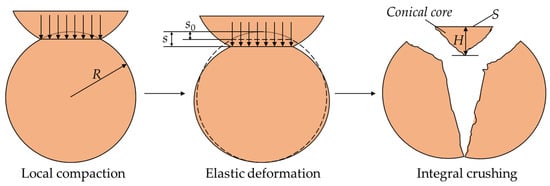 Niu [48] divided the process of the normal contact breakage of two spherical particles into three stages—local compaction, elastic deformation and integral crushing (see Figure 1)—and within this process, the relationship between the normal force Fn and the displacement of contact point s is as follows: