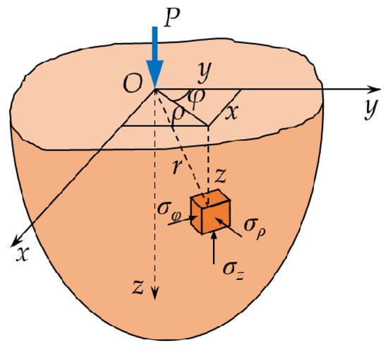 which are close to the calculation results in Figure 3c. The same conclusions are obtained for σρ and σφ. Consequently, the stress components at the point M in Figure 3a are obtained through equivalenting the boundary condition as a uniform load q acting on a horizontal circular area with radius a, as follows: