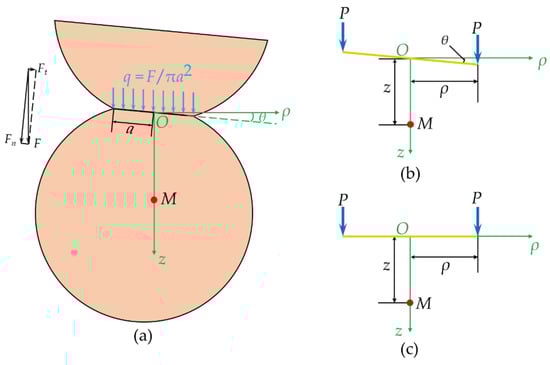 The cylindrical coordinate system shown in Figure 3a is established with the central point of the compacted area as the origin, and the z-axis is in the same direction as the resultant force F between the two spheres. The stress components at the point M on the z-axis inside the sphere can be obtained by superimposing Equations (6)–(8) on the contact surface. Figure 3b shows an inclined plane subjected to two vertical concentrated loads P symmetrical to the origin O, in which θ is very small, and the normal stress component σz of the point M on the z-axis is as follows: