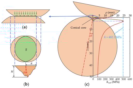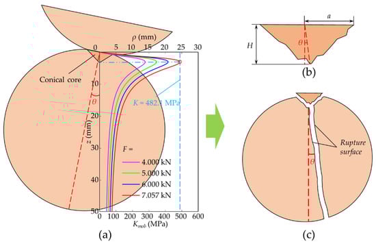 By combining Equations (13), (14) and (16)–(18), the plot of Κmob within the sphere along the z-axis is shown in Figure 4a. The point at which the Κmob value first reaches Κ is the place where the crack starts from, and is also the vertex of the conical core. The crack expands in the direction of the resultant force between two particles and eventually penetrates the entire sphere, evolving into a rupture surface as shown in Figure 4c. The angle between the rupture surface and the diameter passing through the center of the bottom surface of the conical core is θ, which is called the inclination of the rupture surface. Different from the right conical core in the normal contact test, the conical core in the normal–tangential contact test is an oblique cone with an inclination of θ since its vertex must be on the z-axis, as shown in Figure 4b. The bottom area S of the conical core can still be calculated by Equation (4), while its height is calculating using the following: