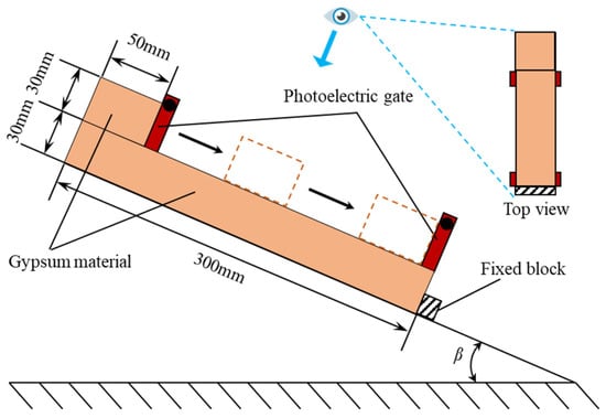 A device for measuring the surface sliding friction coefficient of the material. Both gypsum cubes were fabricated by the same process as the spheres used in the formal test, and the lower cube was fixed on the slope. Two photoelectric gates were used to record the time interval t as the upper gypsum cubes passed through them.