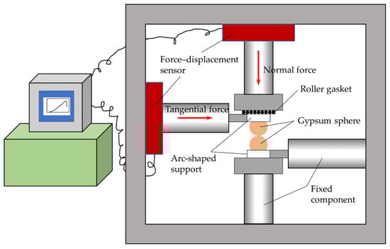The equipment used in the test was the rock rheological testing system (see Figure 7) in the Key Laboratory of Geotechnical and Underground Engineering, Tongji University, China, which can provide a maximum vertical pressure of 500 kN and a horizontal pressure of 300 kN. The minimum controllable deformation value of this rock rheological testing system is 0.001 mm and the minimum controllable mechanical value is 5 N. The system is equipped with a high-speed static force–displacement acquisition system, and the highest acquisition frequency is 100 times per second. In the present study, the acquisition frequency was set to 5 times per second. The upper and lower spheres are fixed with circular arc-shaped supports.