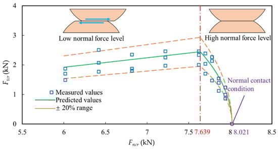 Figure 8 shows the relationship between Fncr and Ftcr, including the theoretical predictions and the data measured in the particle contact test. Obviously, when Fncr < 7.639 kN (), the relationship between Ftcr and Fncr presents a titled straight line with a slope of 0.32 (μ); when Fncr ≥ 7.639 kN (), the Ftcr–Fncr curve is a circular arc centered at the origin of the coordinate. The test under normal contact conditions [48] can be regarded as a specific situation where the tangential force on the contact surface is zero (see the purple circle in Figure 8). From the plot, the data measured in the test are in good agreement with the predicted values. If the normal force is too small, the relative slippage of the two spheres is too large, bringing about a secondary occurrence of local compaction rather than the overall breakage. This situation is too complex and therefore is not discussed in this paper.